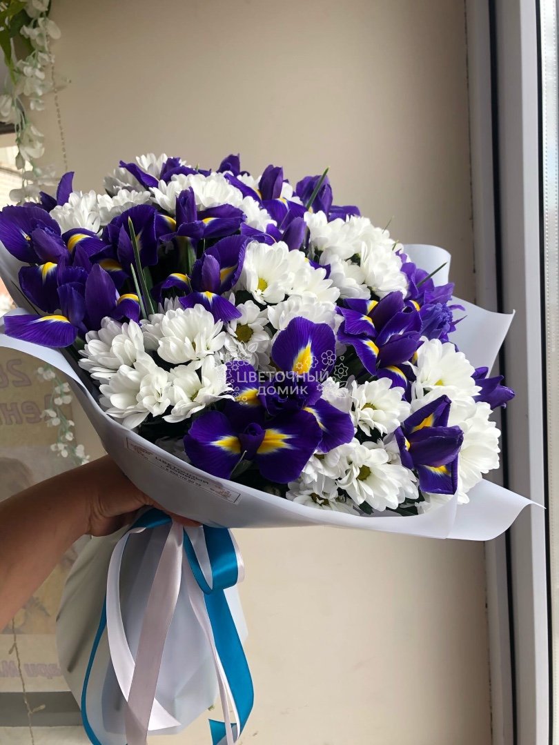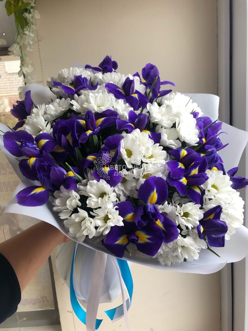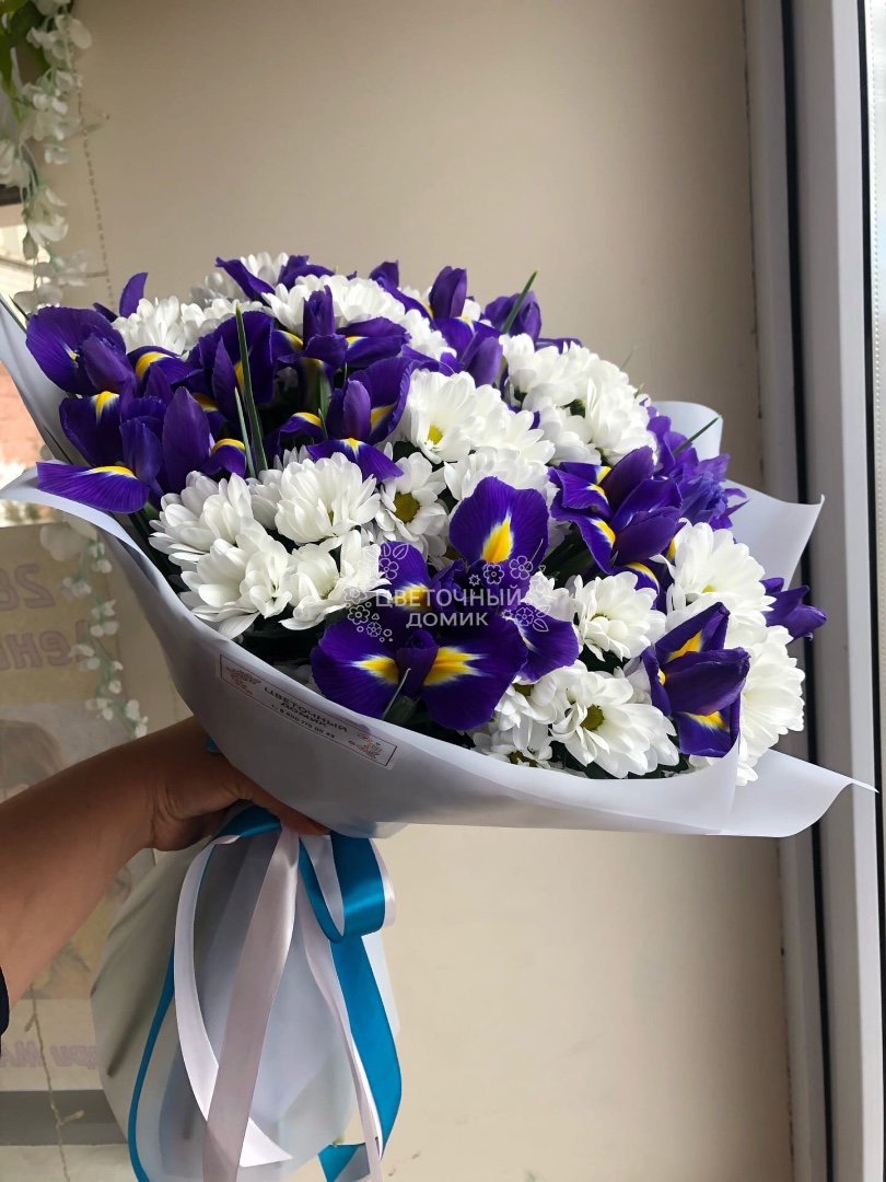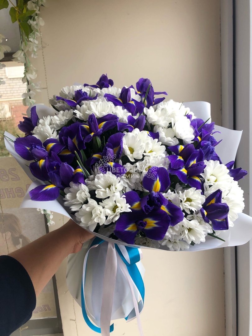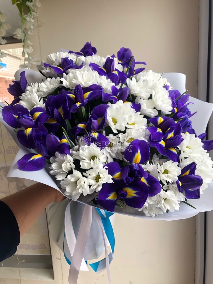 Большой букет из кустовых хризантем и синих ирисов