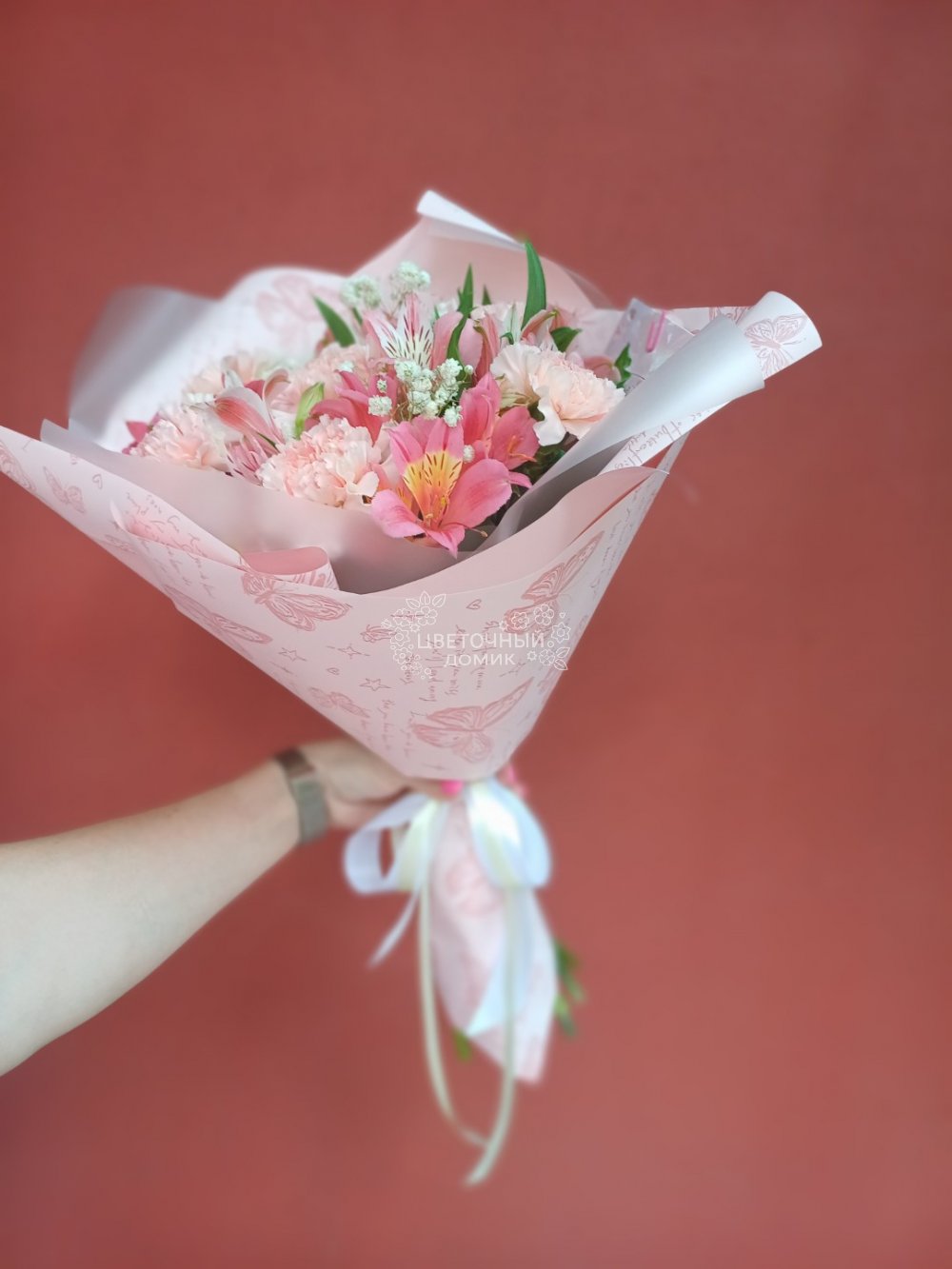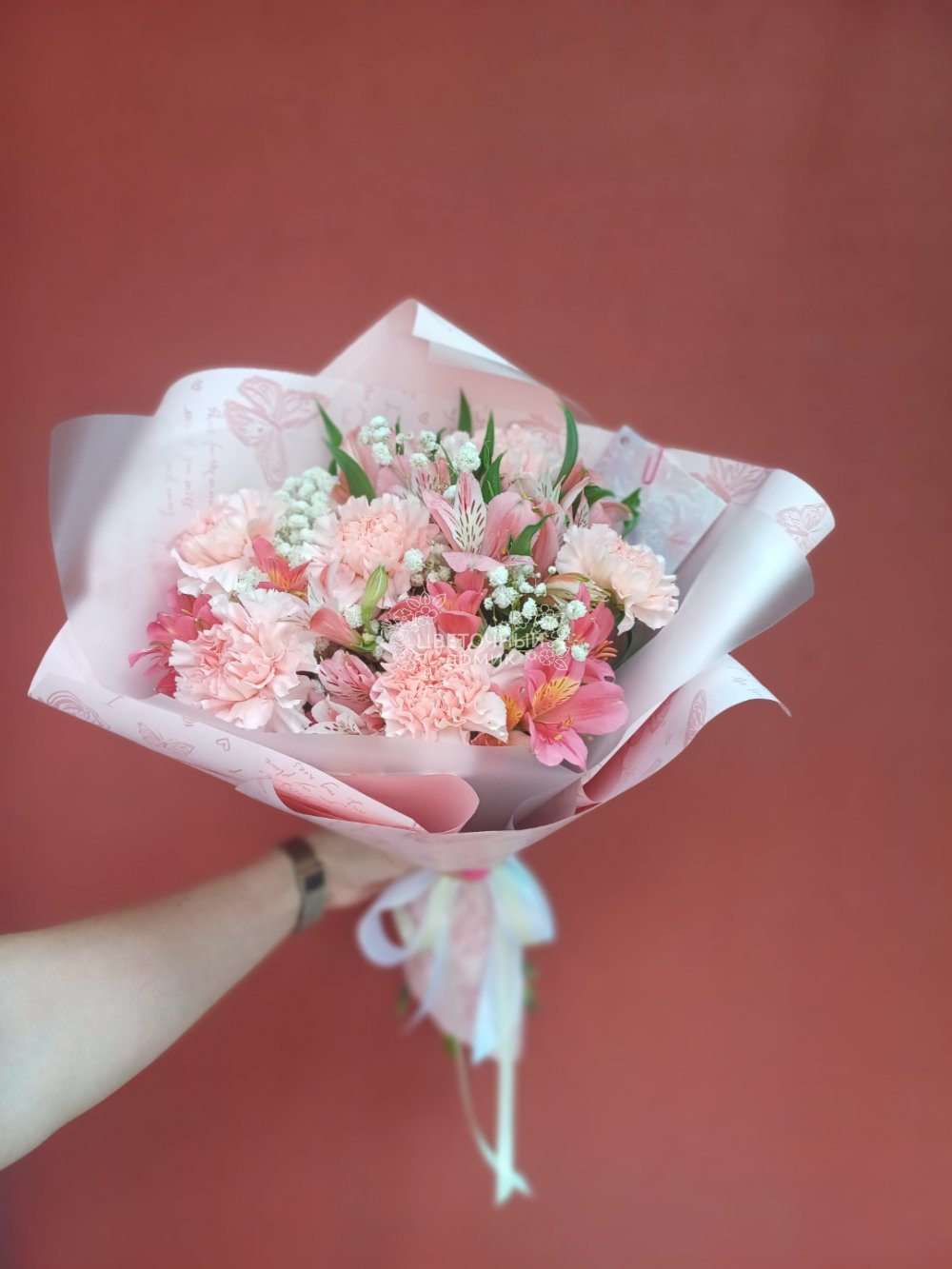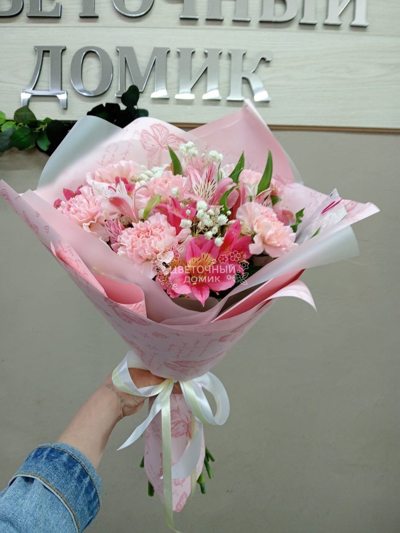 Букет из диантусов, альстромерии и гипсофилы