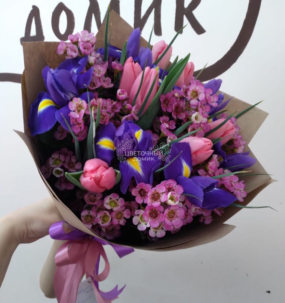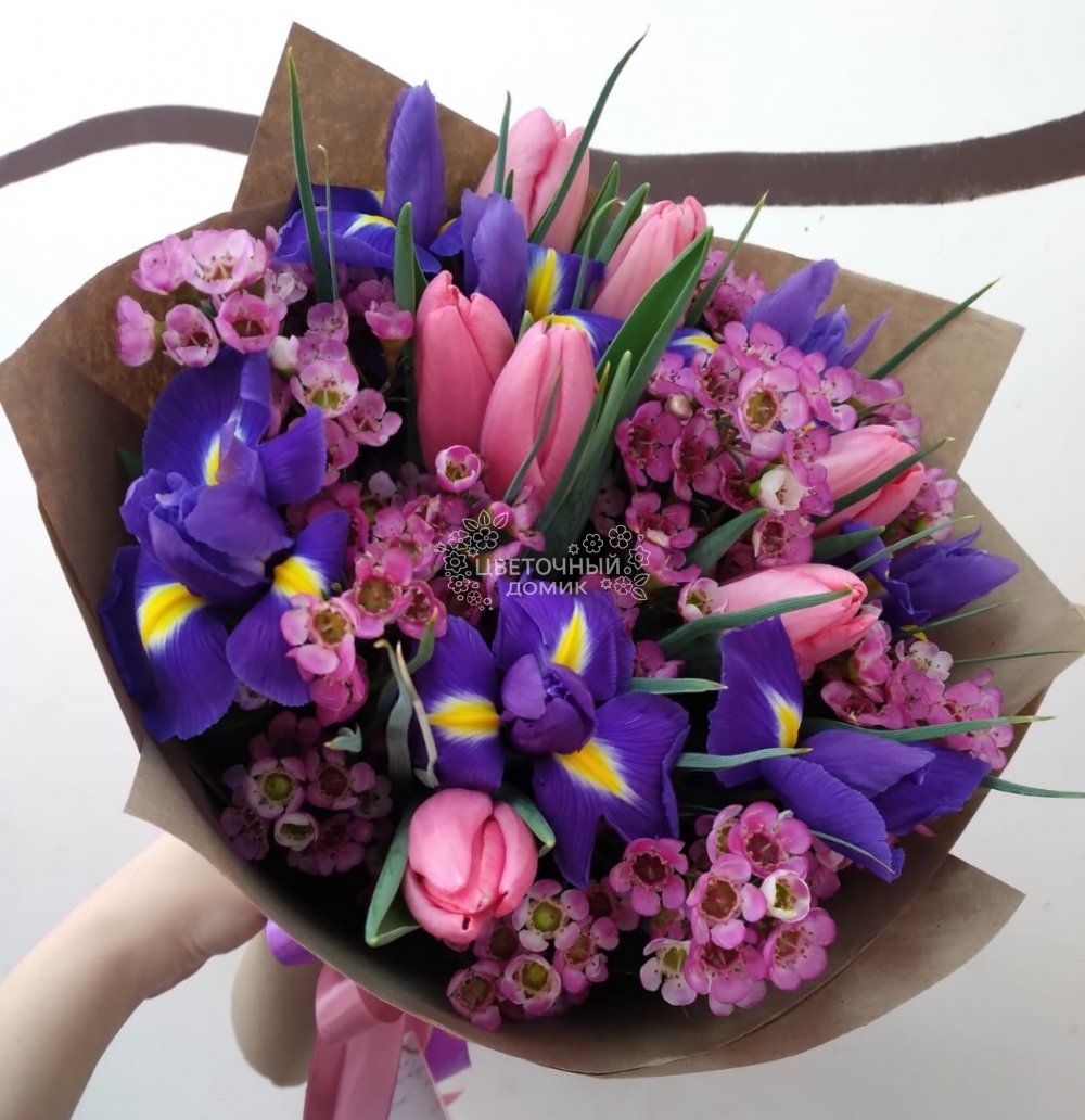 Весенний букет ирисов и тюльпанов