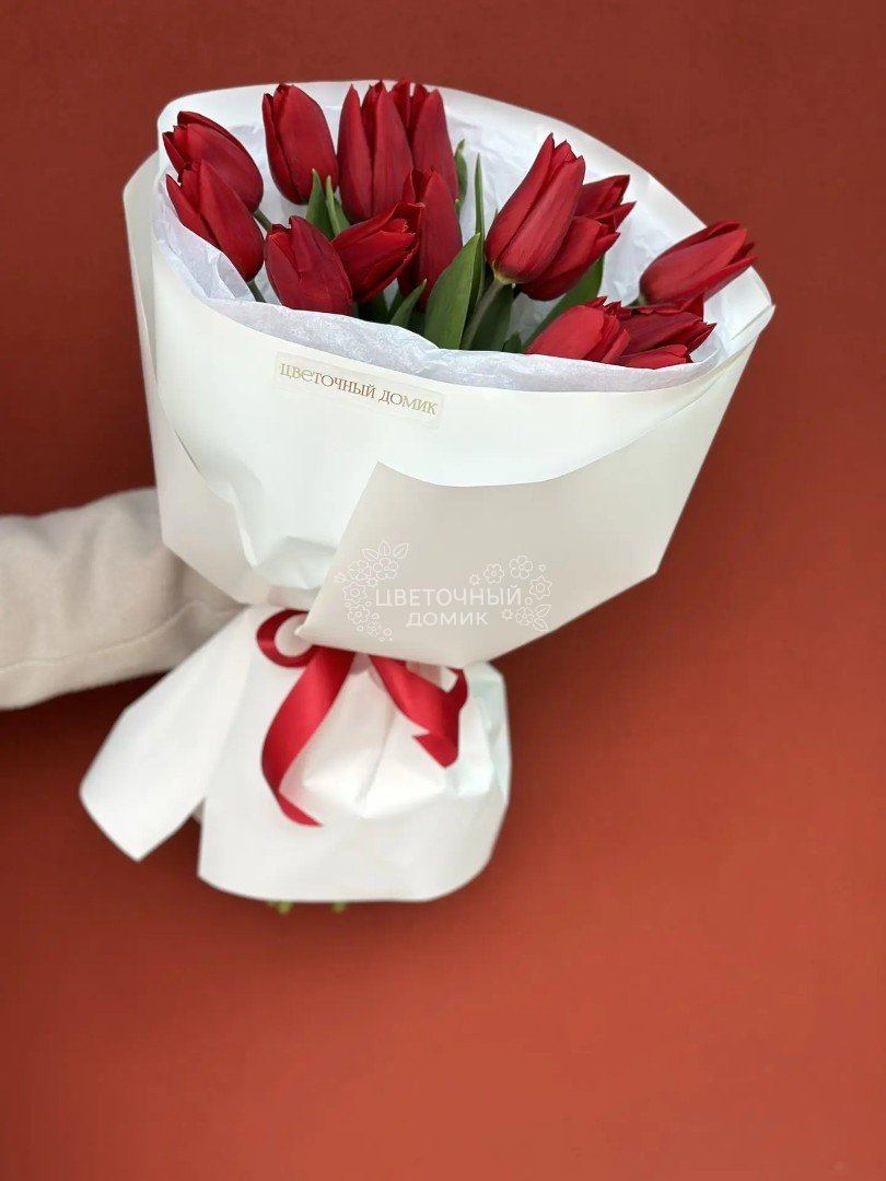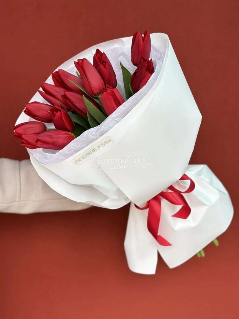 Букет из 15 ярких красных тюльпанов в дизайнерской упаковке