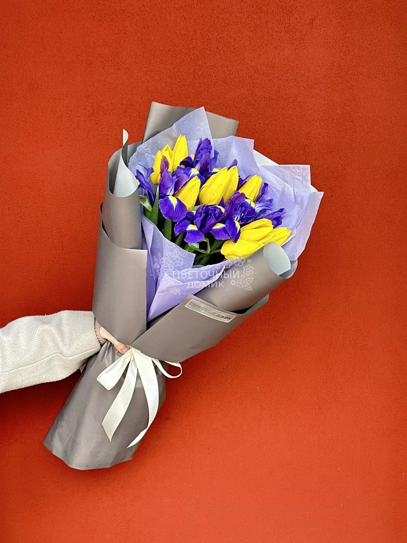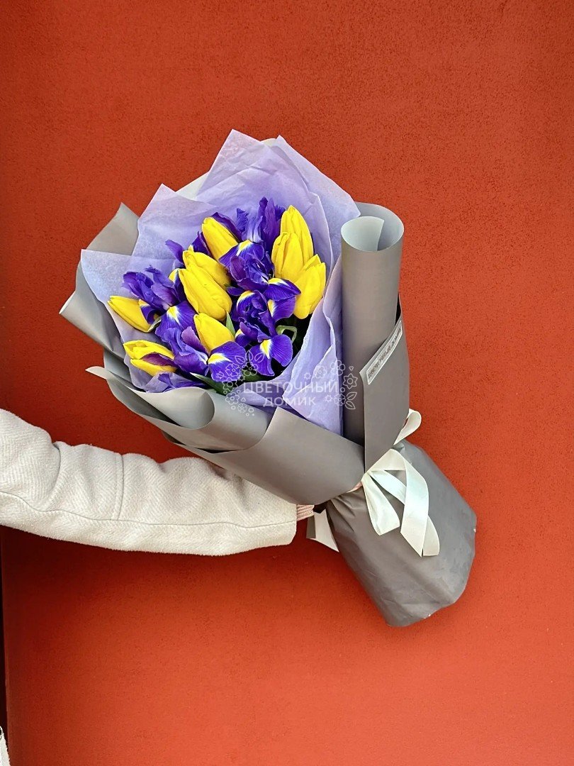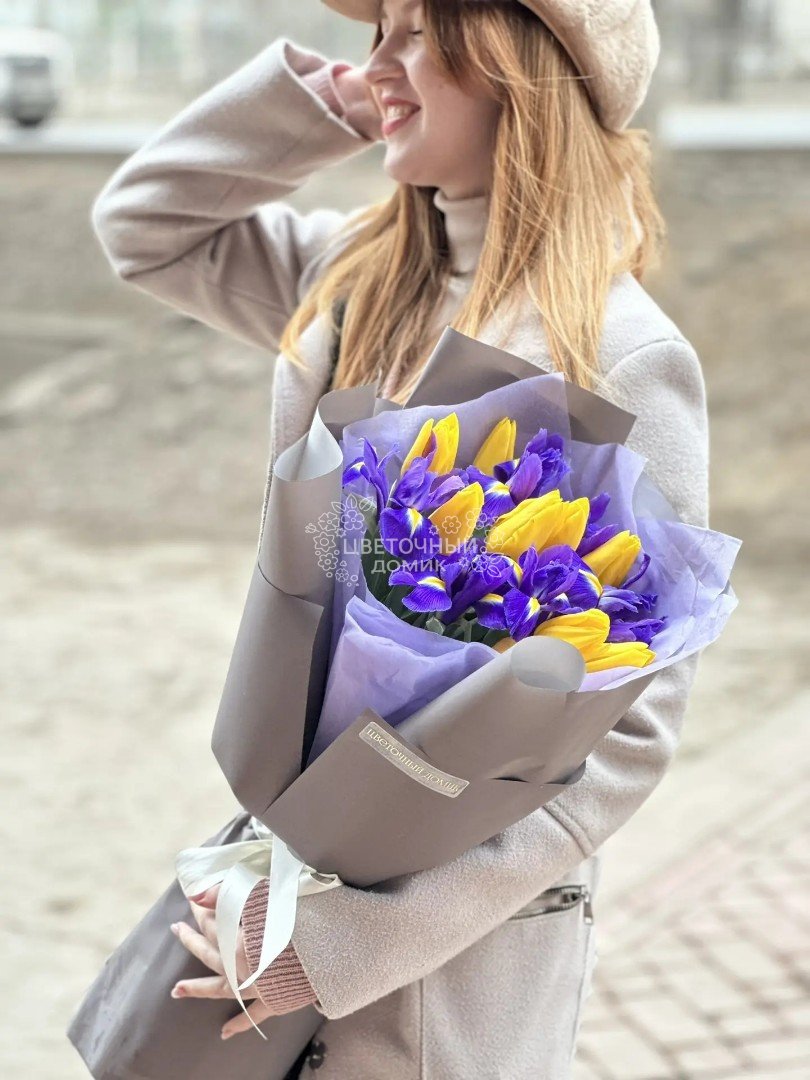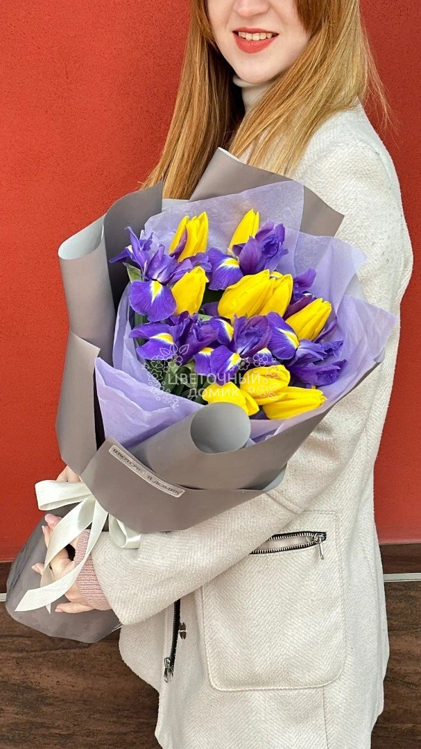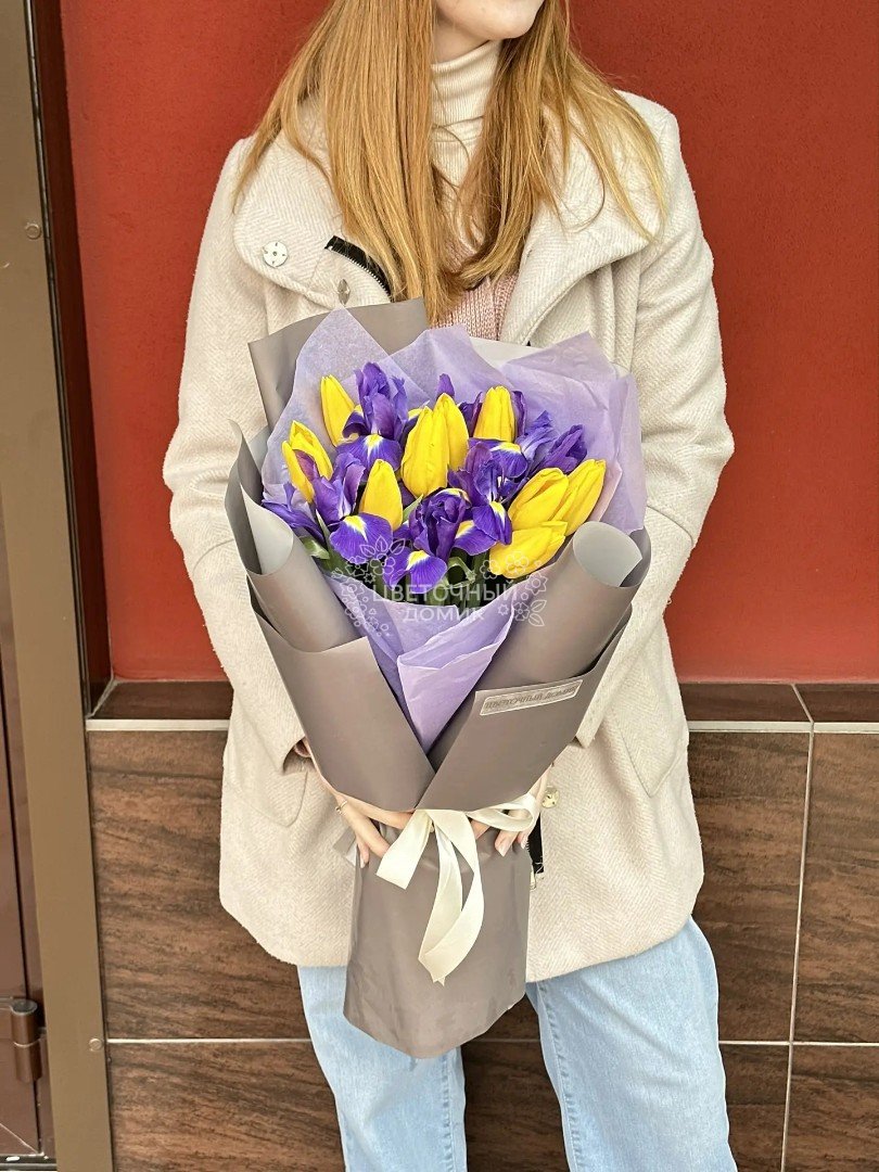 Очаровательный букет с желтыми тюльпанами и яркими ирисами