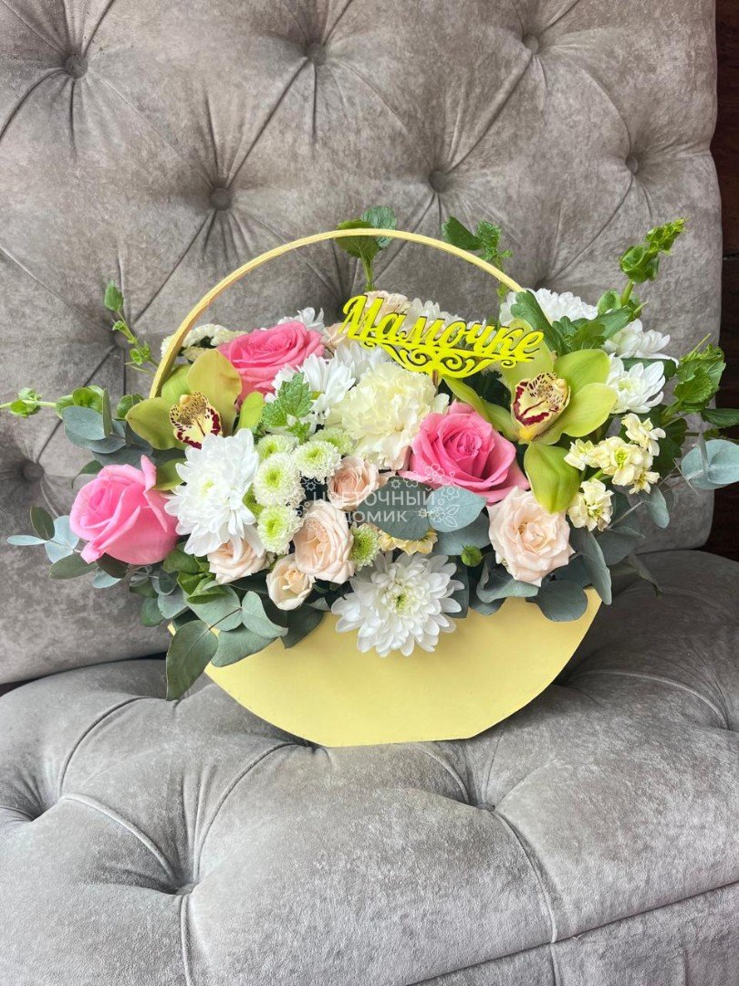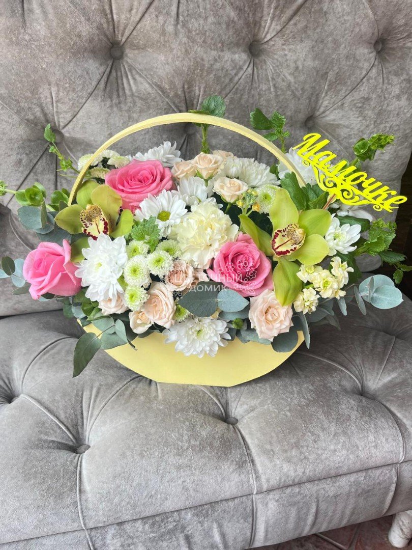 Нежная композиция в деревянной коробке обязательно вызовет улыбку у Вашей Мамы!