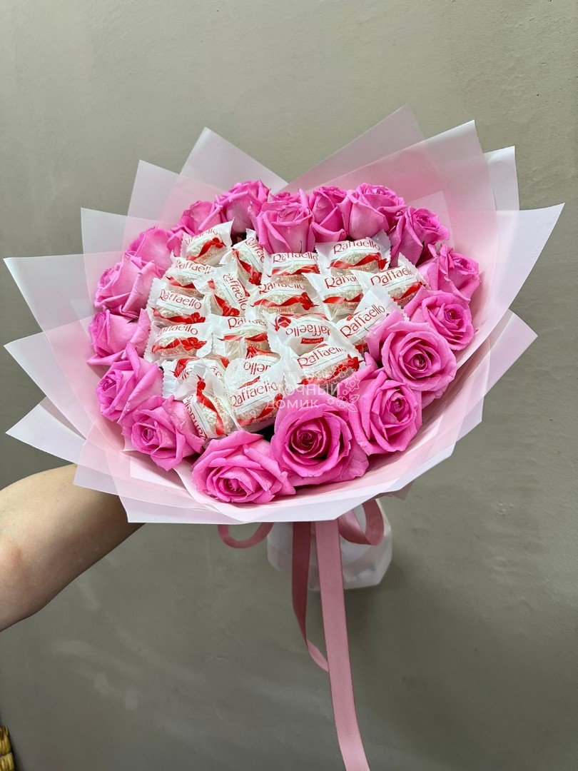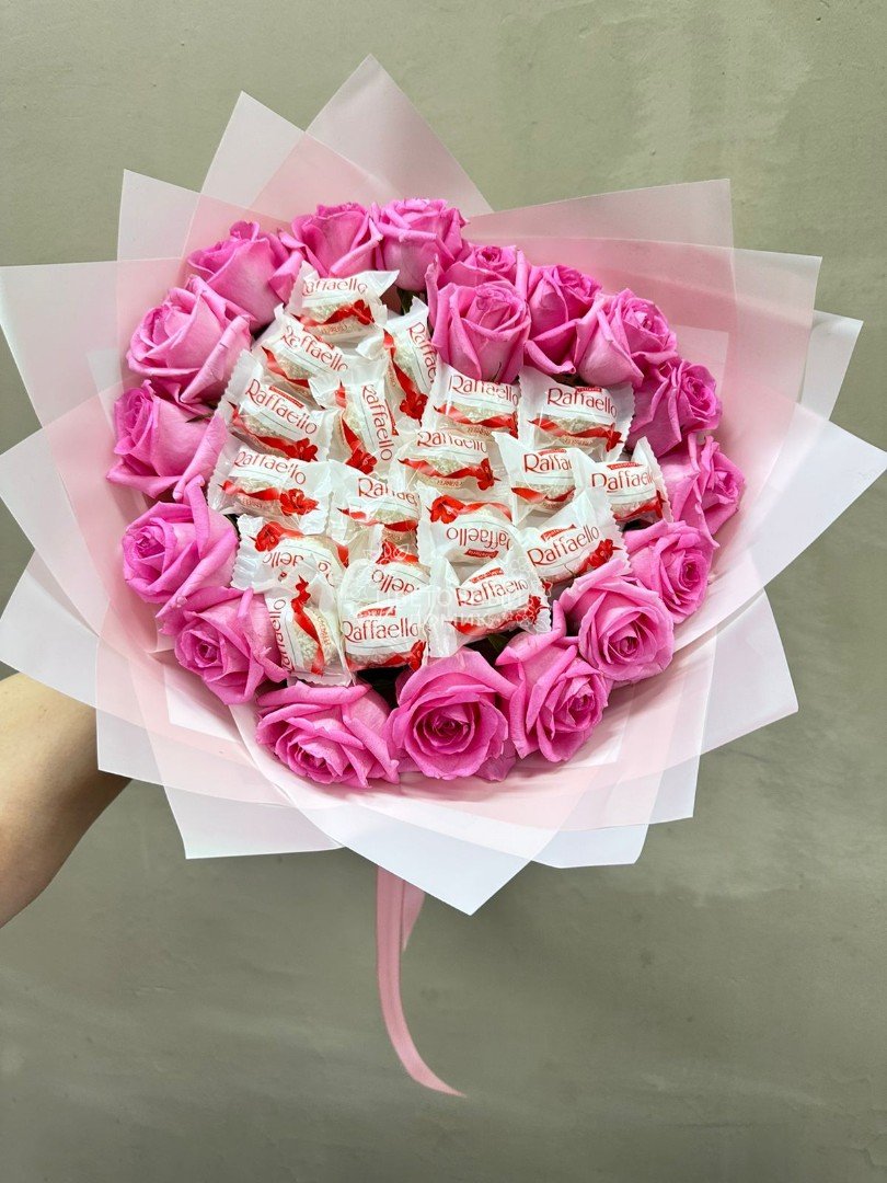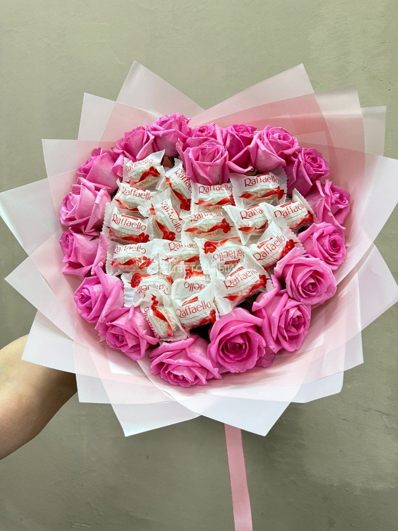 Букет из 17 розовых роз и конфет Рафаэлло. Внимание! Цвет роз на Ваш выбор!