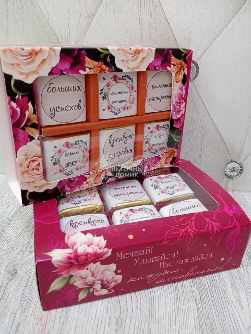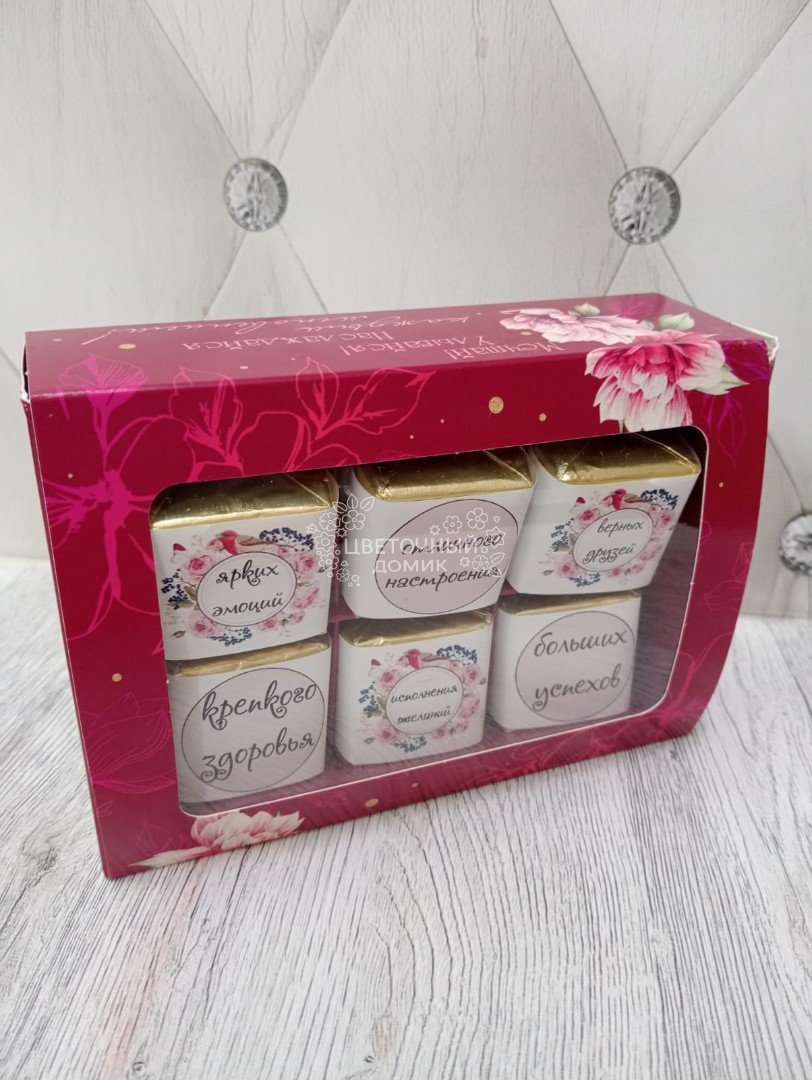 В наборе молочный шоколад с пожеланиями в количестве 12 штук