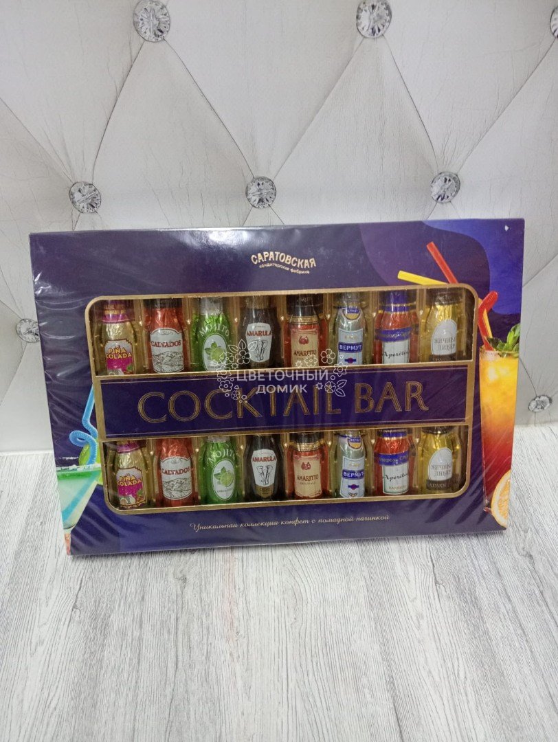 Набор шоколадных конфет, стилизованных в форме бутылочек, с помадной начинкой со вкусами Мохито, Апероль, Кальвадос, ликера Пинаколада, Вермут и др (Россия)